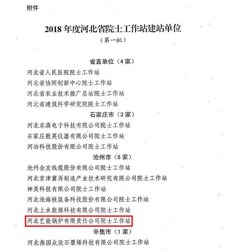 河北省為了推動科技英才“雙百雙千”工程,吸引國內外高端智力參與我省經濟建設,經省科技廳、省委組織部、省科協一致決定設立院士工作站。2018年僅有14個單位入圍,其中就包括吳橋縣河北藝能鍋爐有限公司。