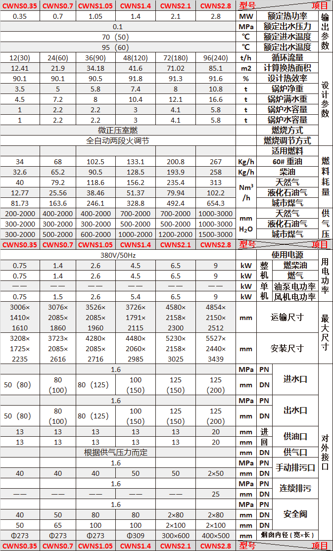 【注】 各種鍋爐都可以整裝出廠,但是由于體積和運輸的原因,一般整裝鍋爐只限300萬大卡以下的鍋爐。